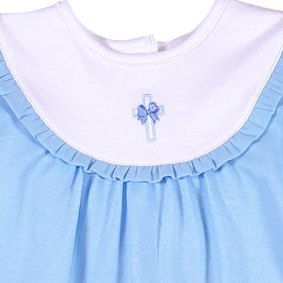 Celebrate her most sacred milestones in this darling baby blue dress featuring a delicate embroidered cross and vintage bib neckline. Crafted for comfort and grace, this timeless set is the perfect choice for baptisms, Easter Sunday, and cherished family gatherings.
