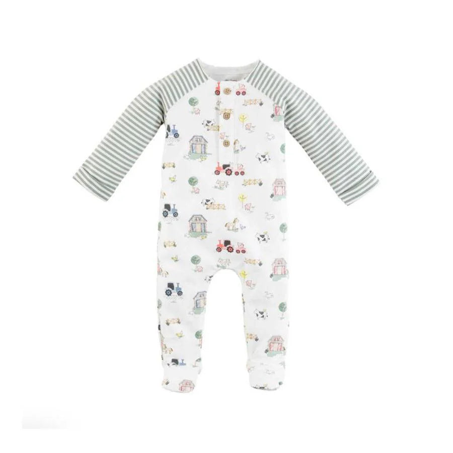 Cotton spandex footed sleeper features jersey raglan long sleeves and coconut wood button placket. Inner leg snap closure.