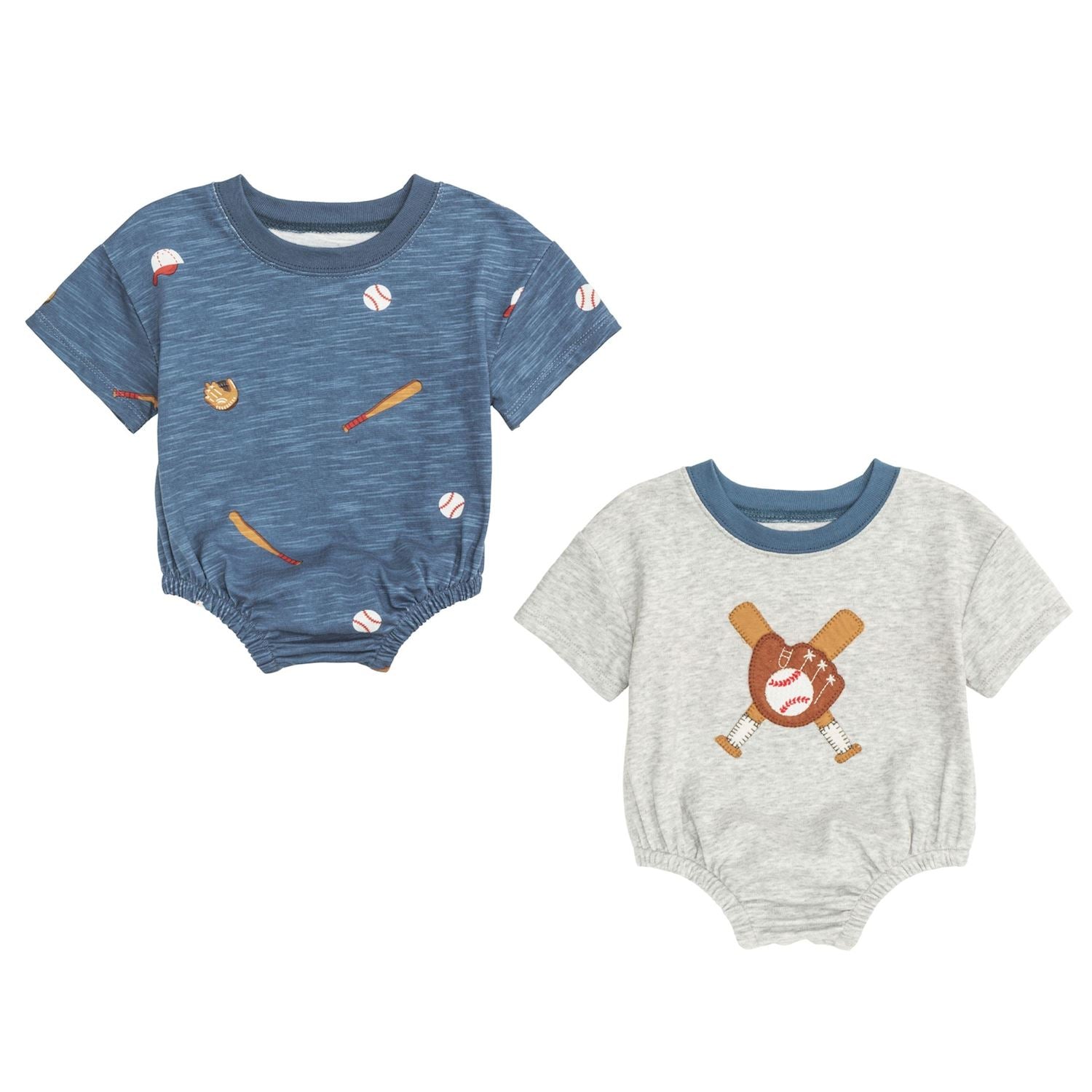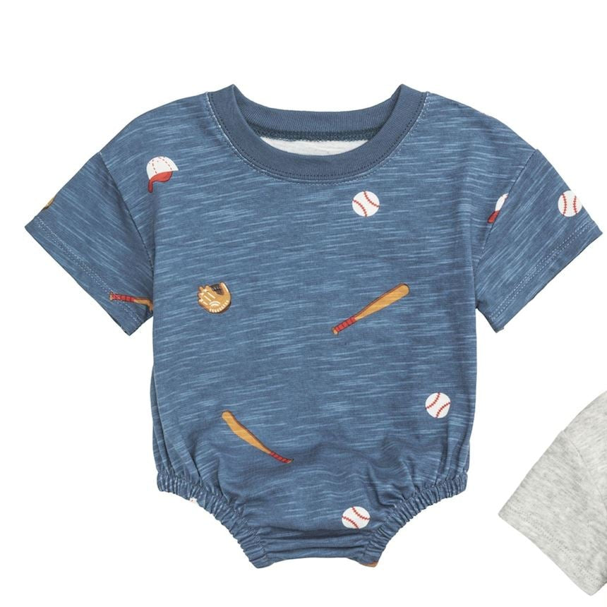 Made from soft cotton slub and patterned interlock fabric, these short sleeve bubbles feature a ribbed neckline, inner leg snaps for easy changes, and playful details that make them perfect for everyday wear. The gray style includes an adorable baseball appliqué, while the blue print adds a sporty twist with allover baseball-themed icons.