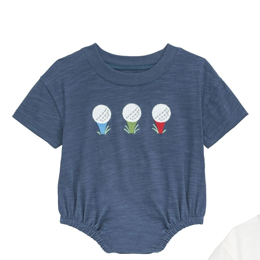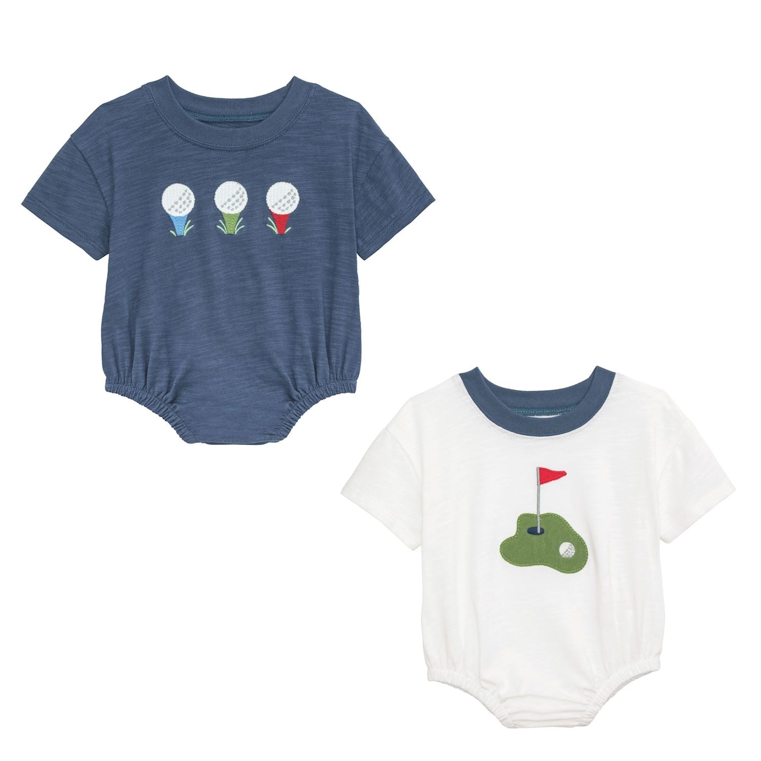 Made from soft cotton slub fabric and available in navy or white, each bubble features playful golf appliqués—from embroidered golf balls on tees to a putting green with a red flag. The short sleeves and elastic leg openings make it perfect for warmer days, while inner leg snaps ensure quick diaper changes for moms on the go.