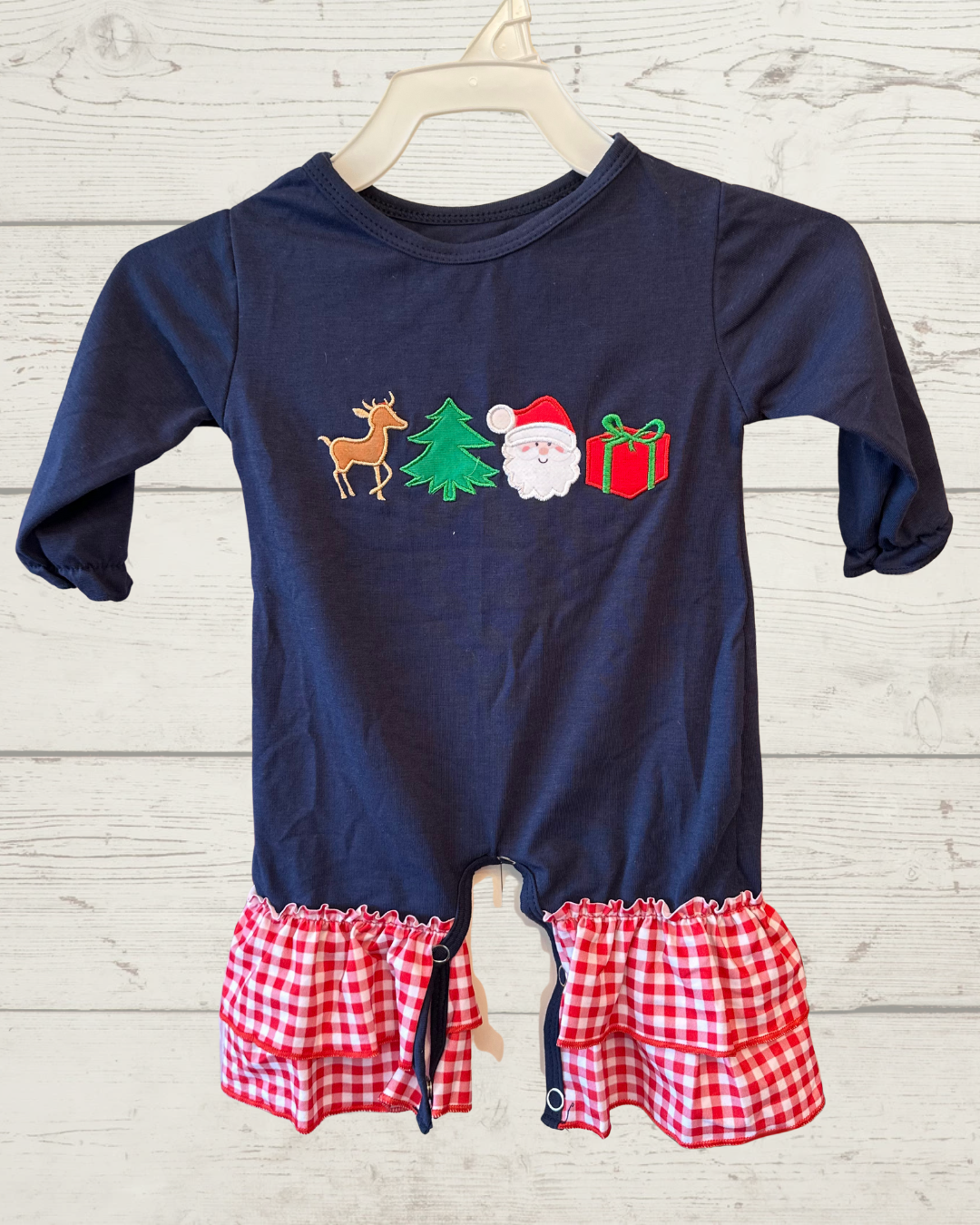 Get in the holiday spirit with this festive Navy Christmas Santa Romper. Made of soft, comfortable material, this romper features a playful Santa design and is perfect for lounging or holiday parties. Spread some cheer with this adorable romper.