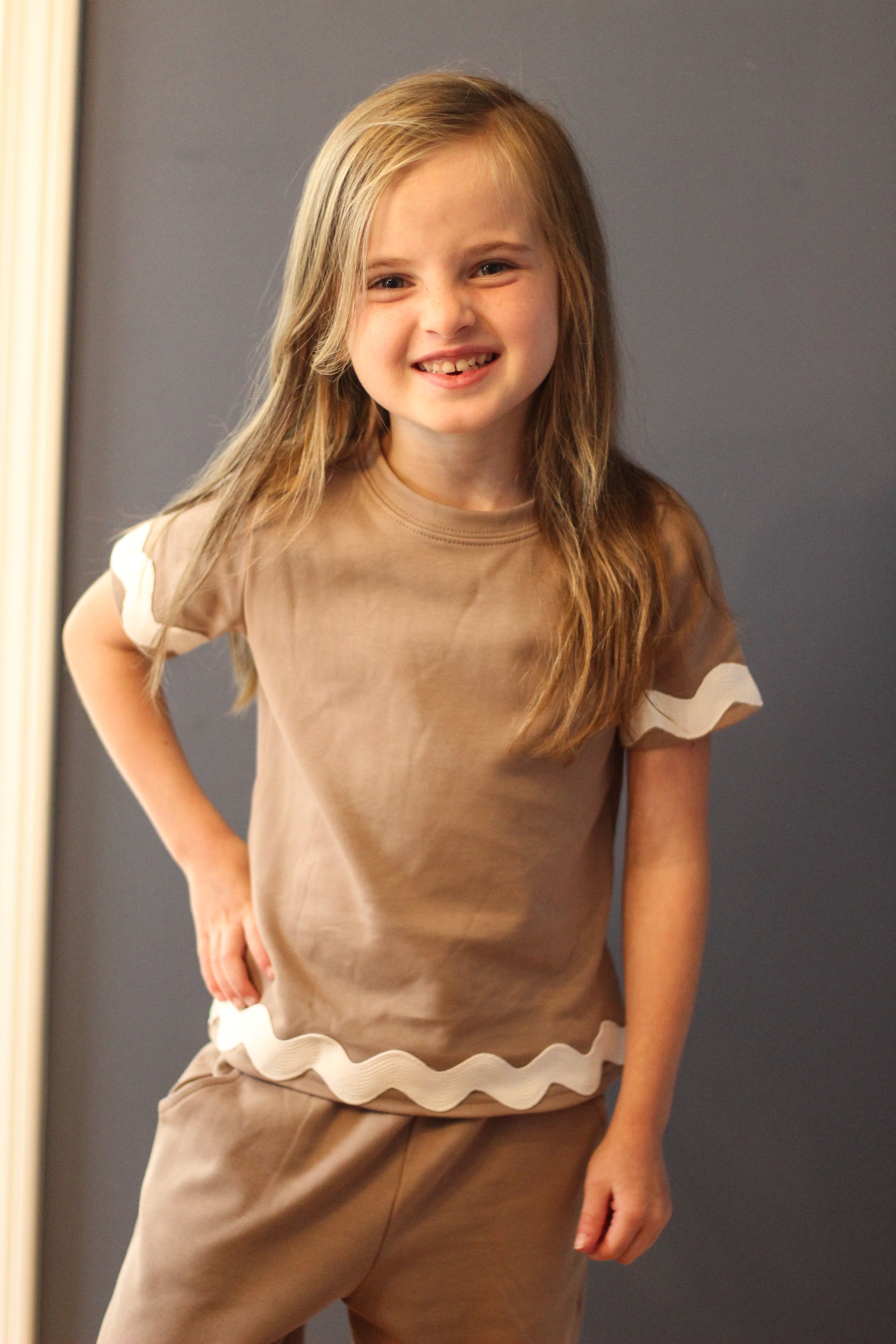 The Banana Split Kids Camila Ric Rac Pant Set is an effortlessly polished outfit that blends everyday comfort with elevated detail. Featuring a soft mocha-brown knit fabric and bold white ric rac trim along the sleeves, hem, and pant legs, this two-piece set delivers a modern twist on classic Southern charm. The elastic waistband and relaxed fit ensure all-day comfort, whether she’s headed to school, brunch, or a family get-together.