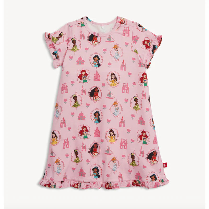 The Magnetic Me Princess Royal Radiance Right Fit Ruffle Nightgown combines royal charm with practical comfort. Adorned with a delightful Disney princess print, this short-sleeve nightgown features hidden magnetic closures at the neckline, helping kids dress themselves with ease. It’s made from RightFit™ fabric, a soft, breathable, and naturally flame-resistant blend that skips the harsh chemicals—but keeps the snuggly softness.