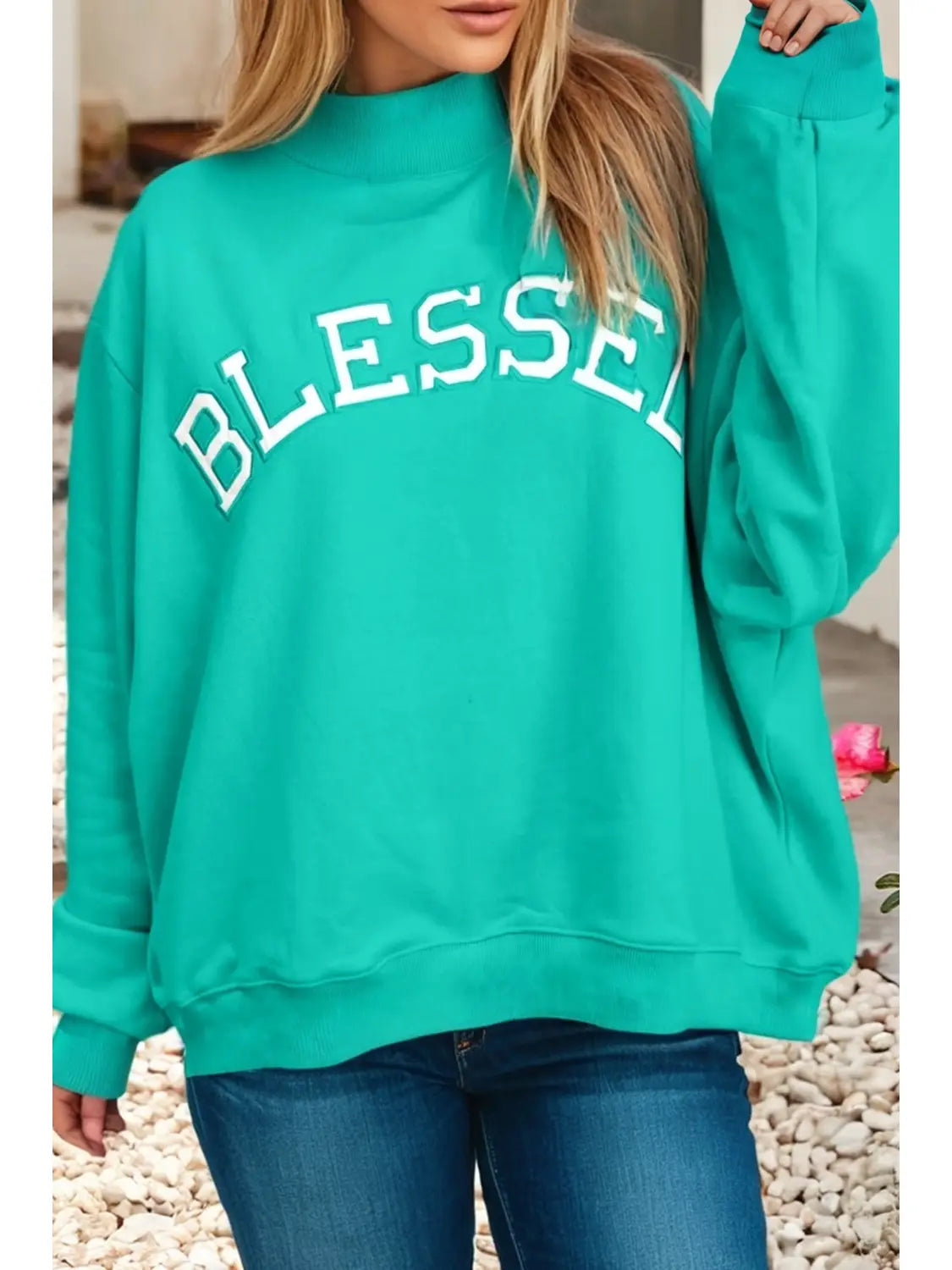 Sea Green Oversized Mock Turtleneck “Blessed” Sweatshirt
