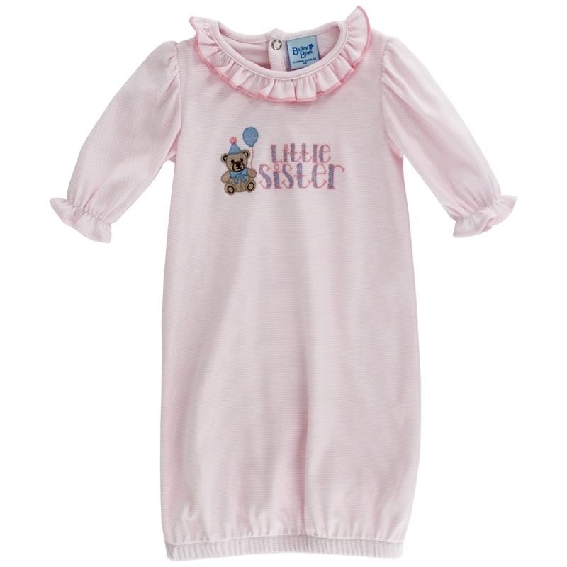 Welcome the newest addition to the family with the Bailey Boys Pink Little Sister Teddy Bear Gown, a timeless piece that blends heirloom charm with modern comfort. Perfect for bringing baby home, newborn photos, or cozy nights, this gown is made of soft cotton and detailed with sweet ruffles and classic embroidery.