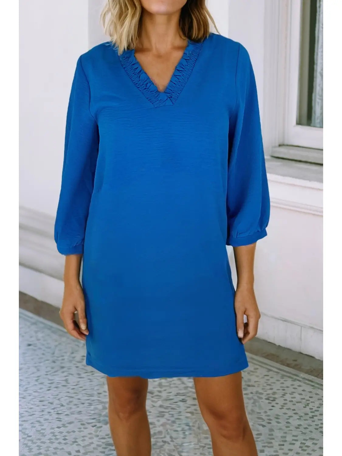 If you love an easy, throw-on dress that still looks polished, this Blue Ruffle V-Neck Dress is one you will reach for over and over again. The vibrant blue brings a cheerful pop of color, while the soft, lightweight fabric keeps things comfortable for everyday wear. Whether you are running errands around town, heading to brunch after church, or dressing it up with a pair of heels for dinner, this dress moves with you and always looks effortlessly put together.