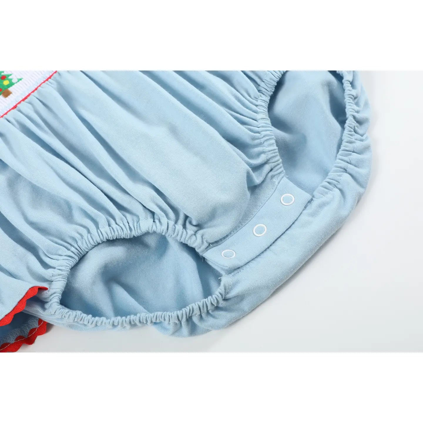 The hand-smocked panel features three cheerful Christmas trees topped with red gingham bows, while ruffled sleeves with red trim add an extra sprinkle of holiday magic. Designed with convenient snaps for quick diaper changes, it’s as practical as it is precious.