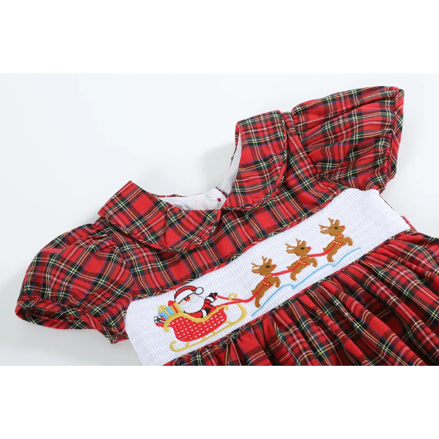 Bring a little extra magic to her holiday season with the Lil Cactus Red Christmas Plaid Santa Sleigh Smocked Dress. Made for memorable moments, this festive frock features a classic red plaid pattern, delicate smocking, and an embroidered scene of Santa and his reindeer ready for takeoff. It’s the perfect dress for Christmas Eve dinners, photos by the tree, or twirling at a holiday party.
